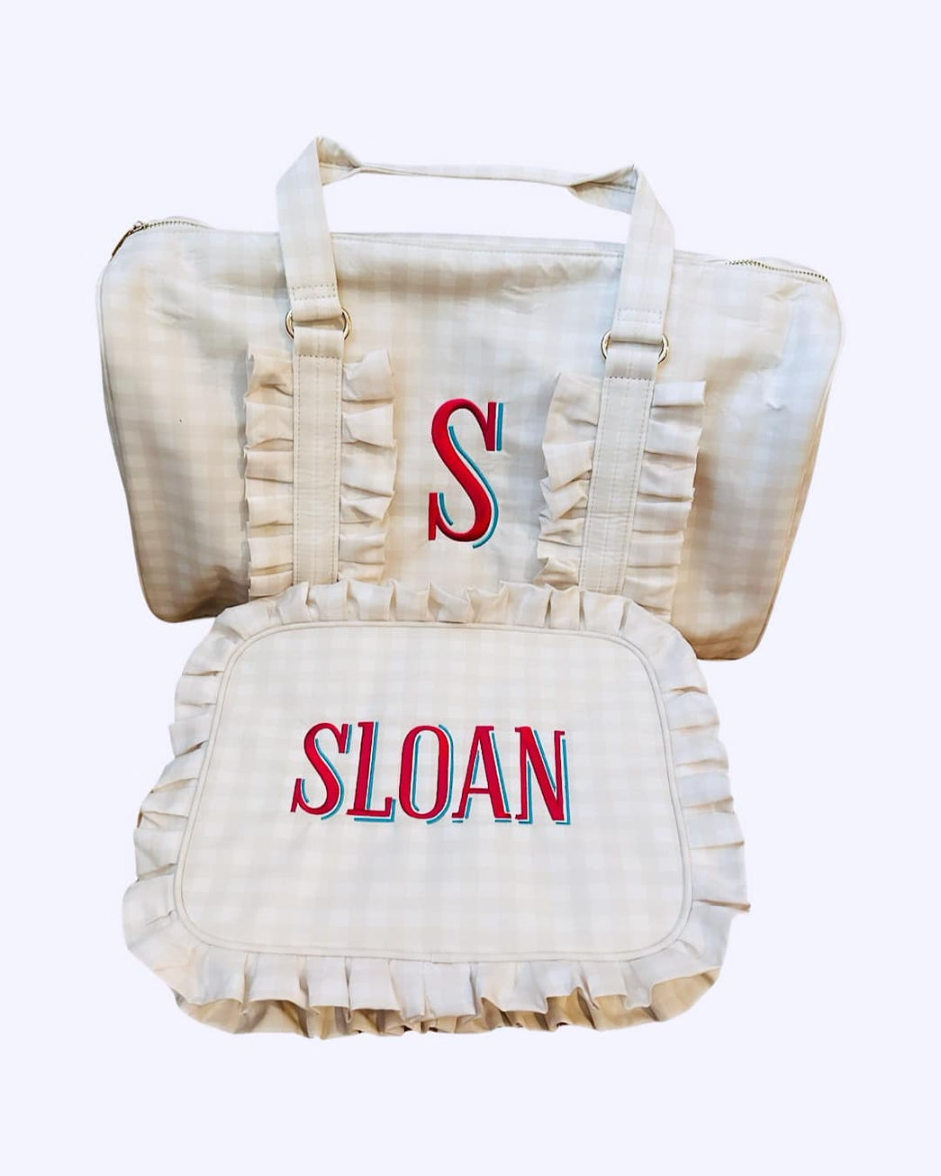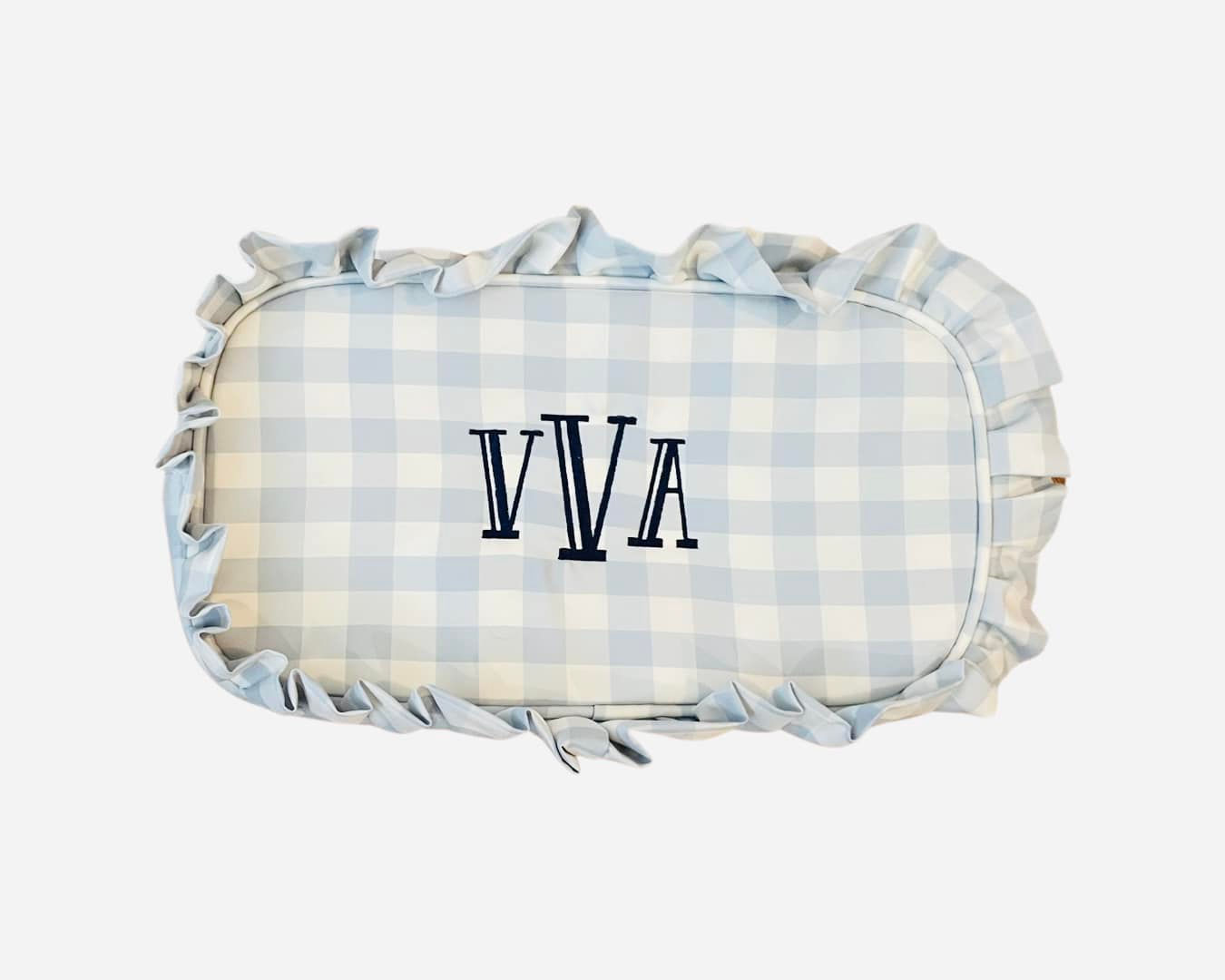 Custom Embroidered Gingham Ruffle Cosmetic Bags!! This travel collection is the cutest!! Add cosmetic bags in 4 different sizes and a duffle bag for a complete set!!