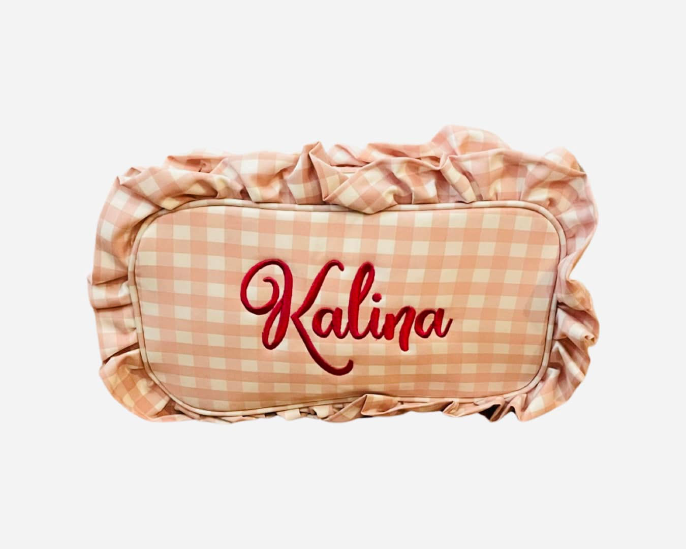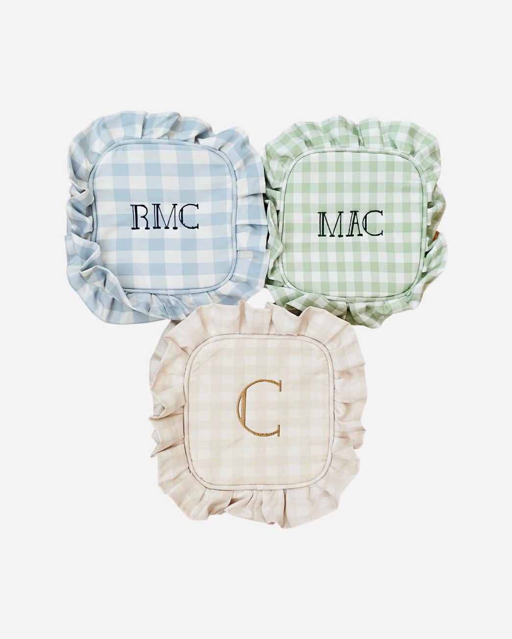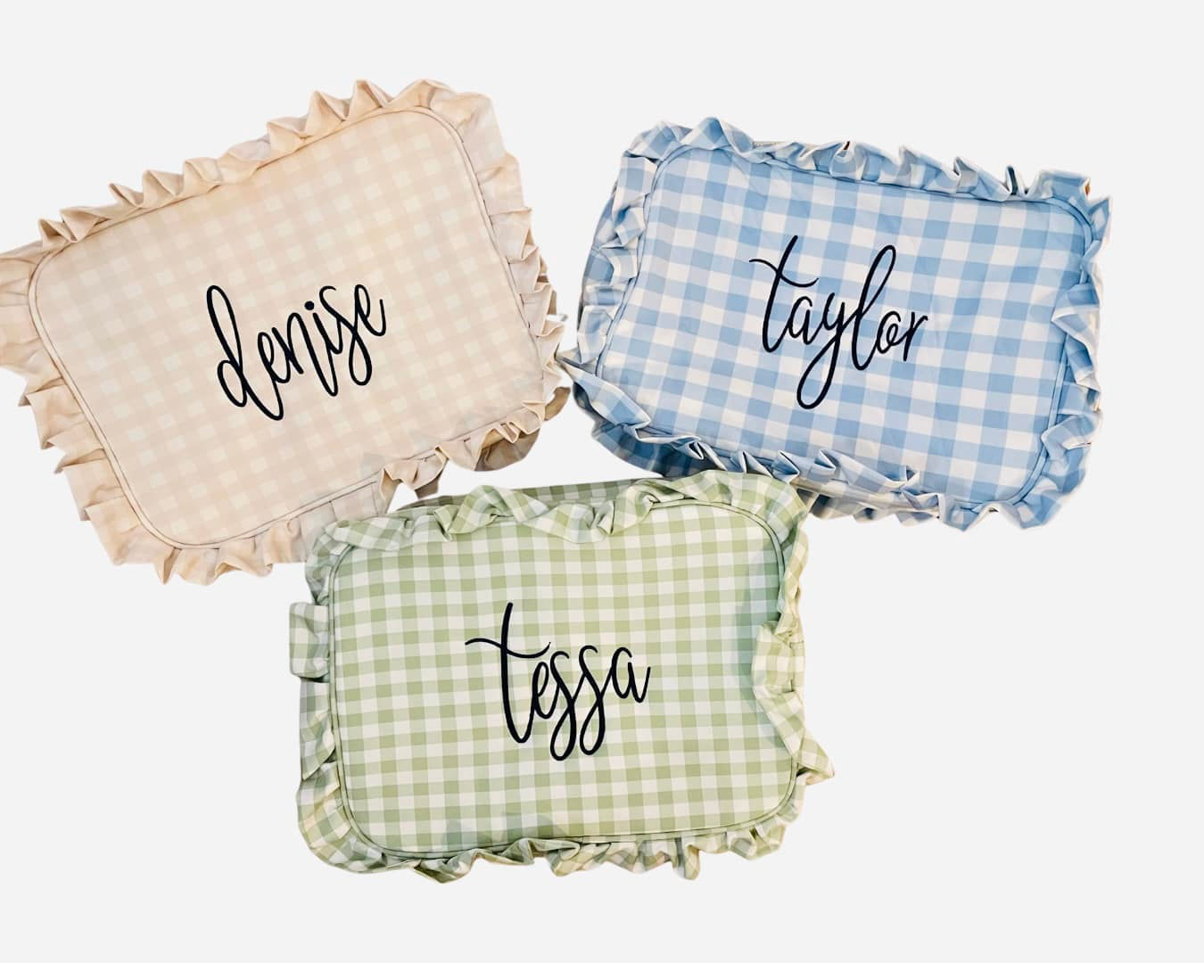 Custom Embroidered Gingham Ruffle Cosmetic Bags
