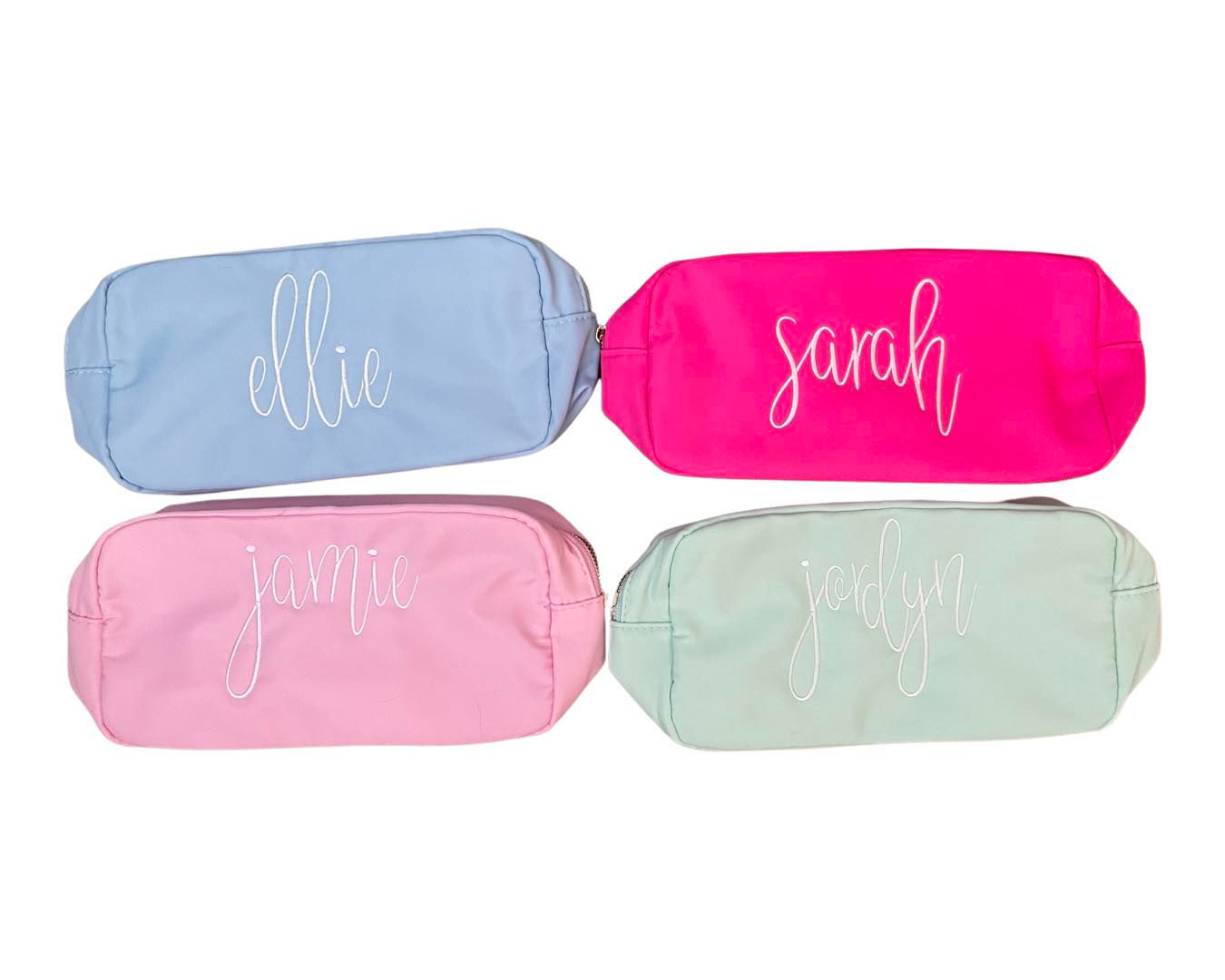 BEST SELLER!! Add a medium custom embroidered nylon cosmetic bag to your collection! Grab a large, small, mini, clear, clear train case & clear small cosmetic bag to complete your set!