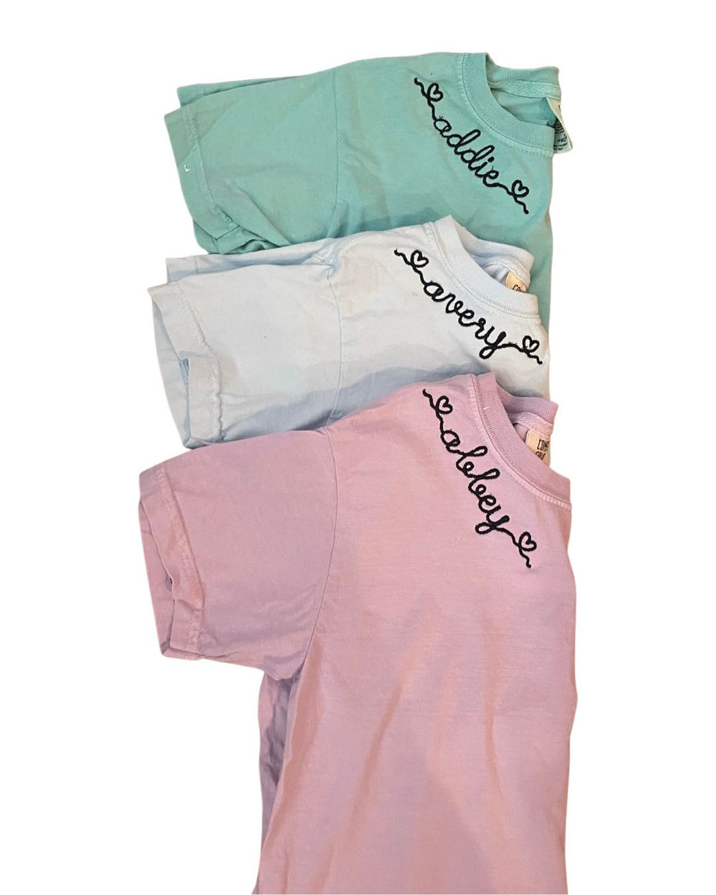 Custom Embroidered T-shirts!! These are great for school, camp or your favotire team(s)!! Choose from embroidery around one side of the collar, 2 sides, or across the front of the t-shirt!!!